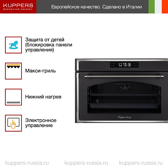 Духовой шкаф Kuppersberg FR 911 ANT SILVER — современный и функциональный прибор, который отлично дополнит вашу кухню. Темный корпус придает ему элегантный и изысканный вид. Управление электронное. Вы легко настроите нужный режим с помощью сенсорных переключателей. Дверца съемная, это облегчает уборку. Панель управления можно заблокировать от детей. Малыши не смогут случайно изменить настройки. Вы можете готовить блюда на нескольких уровнях одновременно. Мощности прибора вполне достаточно.