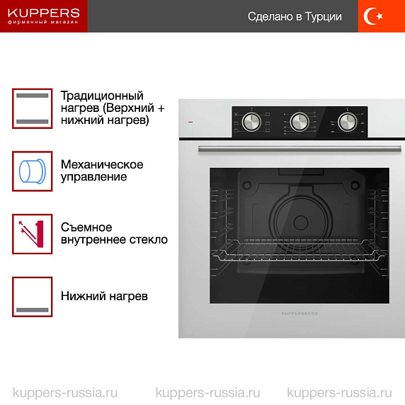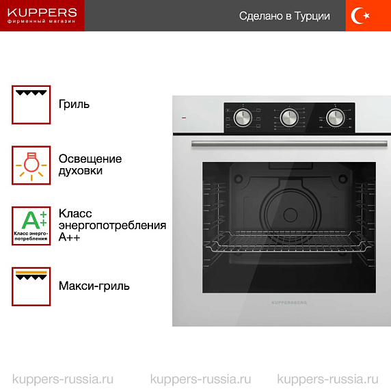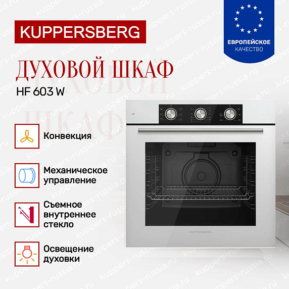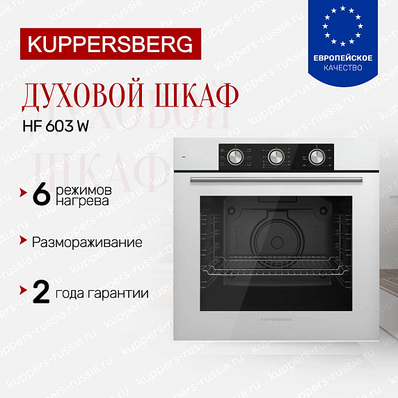 Духовой шкаф Купперсберг HF 603 W — это выбор тех, кто ищет не «умную» технику, а умную практичность. Здесь нет лишнего: только проверенные решения, надежные материалы и лаконичный дизайн, который не выйдет из моды.