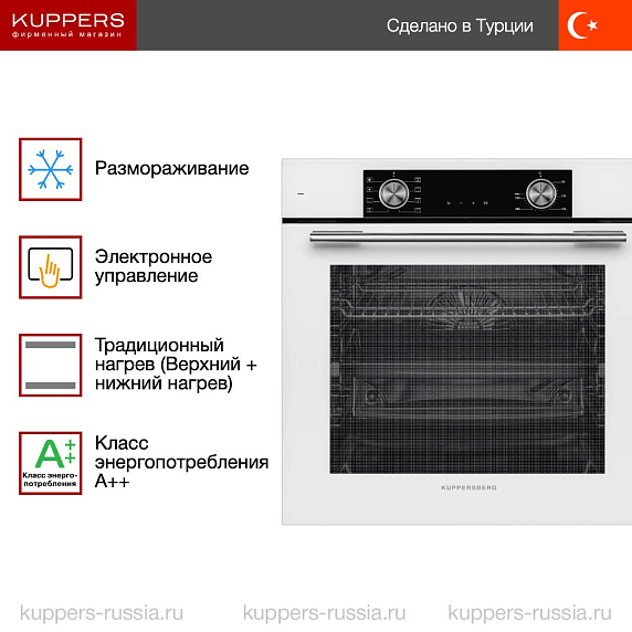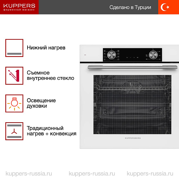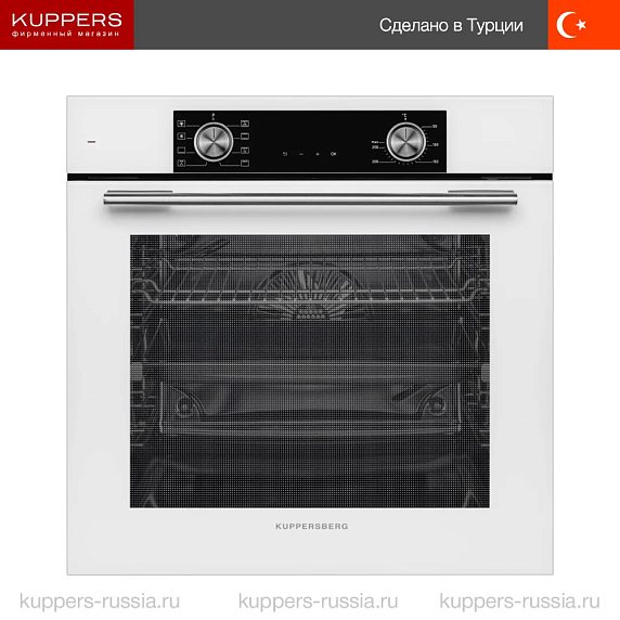 Духовой шкаф Kuppersberg HF 608 W представляет собой современное и функциональное решение для любой кухни, выполненное в элегантном белом цвете с контрастной черной фурнитурой. Его полноразмерный корпус идеально вписывается в нишу размером 60×56×55 см, обеспечивая удобство встраивания и гармоничное сочетание с интерьером. Высота и ширина устройства составляют 59,5 см, а глубина — 56,7 см, что позволяет разместить его даже в компактных кухонных гарнитурах. Изделие произведено в Турции, что гарантирует высокое качество сборки и надежность в эксплуатации. Электрический способ подключения обеспечивает стабильную работу и равномерный нагрев внутри камеры объемом 80 литров, позволяя готовить блюда любых размеров и сложности.