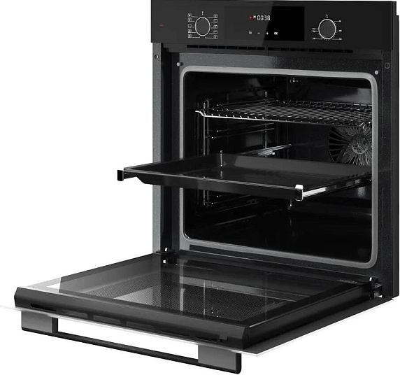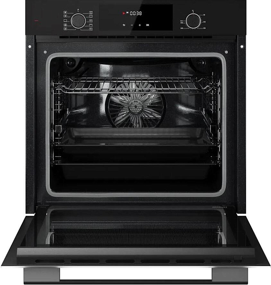 Управление осуществляется посредством электронного сенсорного программатора с цифровым дисплеем, что обеспечивает удобство и точность настройки функций. Сенсорные утапливаемые поворотные переключатели добавляют эргономичности, позволяя легко выбирать нужные параметры без лишних усилий. Наличие функций часов и таймера позволяет планировать процесс приготовления, контролируя время для достижения оптимального результата.