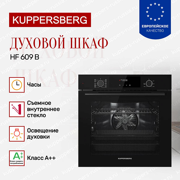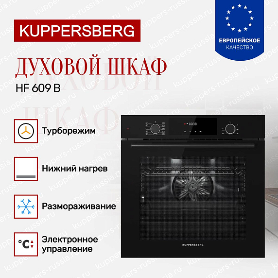 Духовой шкаф Kuppersberg HF 609 B представляет собой современное решение для встраивания в кухонный гарнитур, выполненное в элегантном черном цвете, который гармонично впишется в интерьер любой кухни. Его полноразмерный корпус с габаритами 59.5 см в высоту и ширину, а также глубиной 56.7 см, идеально подходит для ниш с размерами 60×56×55 см, обеспечивая удобство монтажа и эстетическую завершенность пространства. Современный дизайн подчеркивается строгими линиями и минималистичным оформлением, что делает прибор не только функциональным, но и стильным элементом кухонного оборудования.