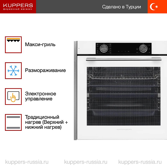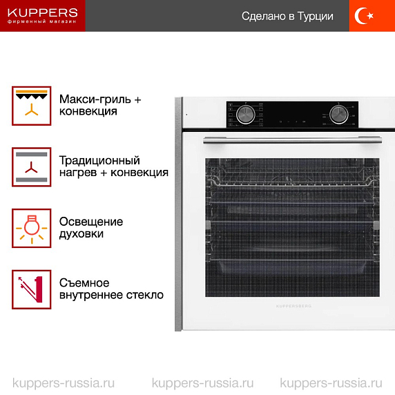 Торговая марка Kuppersberg уже 15 лет находится на рынке и входит в ТОП-10 производителей бытовой техники в России. По всему миру расположено более десяти заводов компании Куперсберг, на которых собирается техника. Приятный дизайн с лаконичными линиями отражает главную философию Северной Европы: надёжность — превыше всего. Поэтому можно быть уверенным, что даже газовая духовка прослужит долго и, при соблюдении указанных в инструкции, правил, останется максимально безопасным прибором. Электрические модели также отражают надёжность, при этом дают больше функций для процесса приготовления пищи.