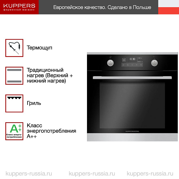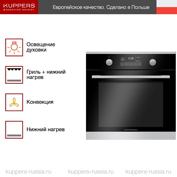Торговая марка Kuppersberg уже 15 лет находится на рынке и входит в ТОП-10 производителей бытовой техники в России. По всему миру расположено более десяти заводов компании Куперсберг, на которых собирается техника. Приятный дизайн с лаконичными линиями отражает главную философию Северной Европы: надёжность — превыше всего. Поэтому можно быть уверенным, что даже газовая духовка прослужит долго и, при соблюдении указанных в инструкции, правил, останется максимально безопасным прибором. Электрические модели также отражают надёжность, при этом дают больше функций для процесса приготовления пищи.