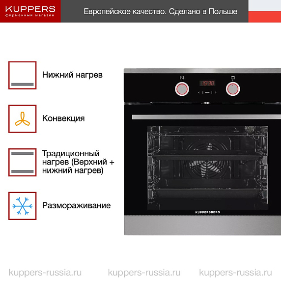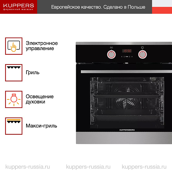 Торговая марка Kuppersberg уже 15 лет находится на рынке и входит в ТОП-10 производителей бытовой техники в России. По всему миру расположено более десяти заводов компании Куперсберг, на которых собирается техника. Приятный дизайн с лаконичными линиями отражает главную философию Северной Европы: надёжность — превыше всего. Поэтому можно быть уверенным, что даже газовая духовка прослужит долго и, при соблюдении указанных в инструкции, правил, останется максимально безопасным прибором. Электрические модели также отражают надёжность, при этом дают больше функций для процесса приготовления пищи.
