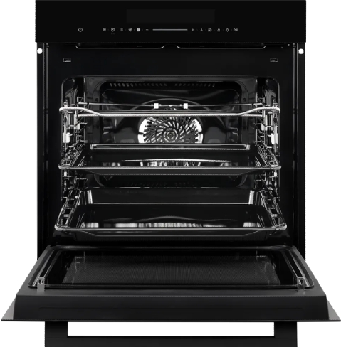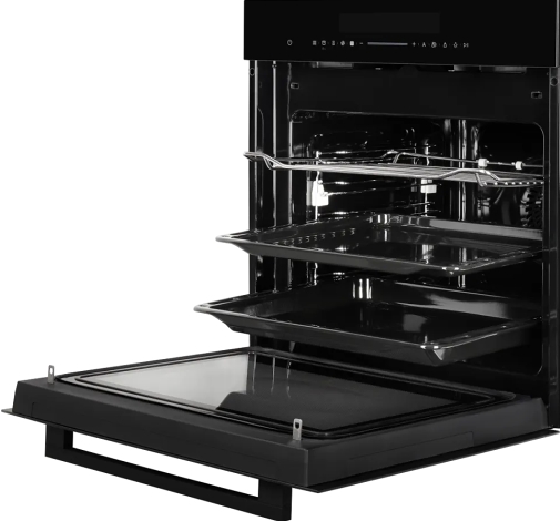 Чёрный глянцевый фасад с матовыми акцентами создаёт эффект глубины, визуально «растворяя» технику в фасадах кухонного гарнитура. Цветовая гамма — угольно-чёрная, с лёгким графитовым отливом — подчёркивает строгость линий и подходит как для классических, так и для ультрасовременных интерьеров. Панель управления — полностью сенсорная, без физических кнопок, с тактильной обратной связью и подсветкой активных зон. Даже при ярком освещении информация читается без искажений. Цифровые часы и таймер работают независимо от активного режима, что удобно для планирования готовки заранее.