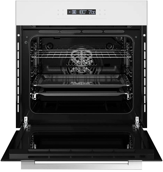 Модель выполнена в универсальном белом цвете, который органично вписывается как в классические, так и в минималистичные кухонные композиции. Белоснежный фасад дополняется аналогичной по оттенку фурнитурой, создавая цельный и гармоничный визуальный ансамбль. Панель управления реализована в виде сенсорного интерфейса с интуитивно понятной логикой навигации. Цифровой дисплей отображает текущее время, выбранную программу и оставшееся время до окончания приготовления, что делает процесс готовки максимально контролируемым даже для новичков.