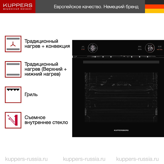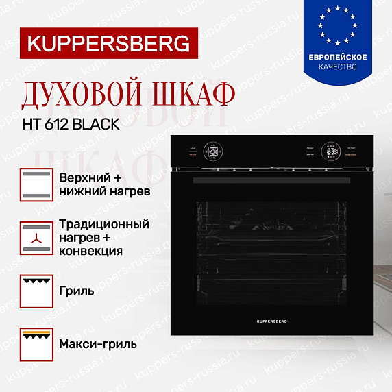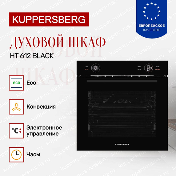 Духовой шкаф Kuppersberg HT 612 Black представляет собой идеальное сочетание современного дизайна и передовых технологических решений, созданных для удобства и комфорта на кухне. Его габариты (высота 59.6 см, ширина 59.5 см, глубина 56.6 см) позволяют гармонично встроить устройство в нишу размером 60×56×55 см, что делает его универсальным решением для большинства кухонных гарнитуров. Черный цвет корпуса и фурнитуры придает прибору элегантный и стильный внешний вид, который станет акцентом в интерьере и подчеркнет статус владельца.