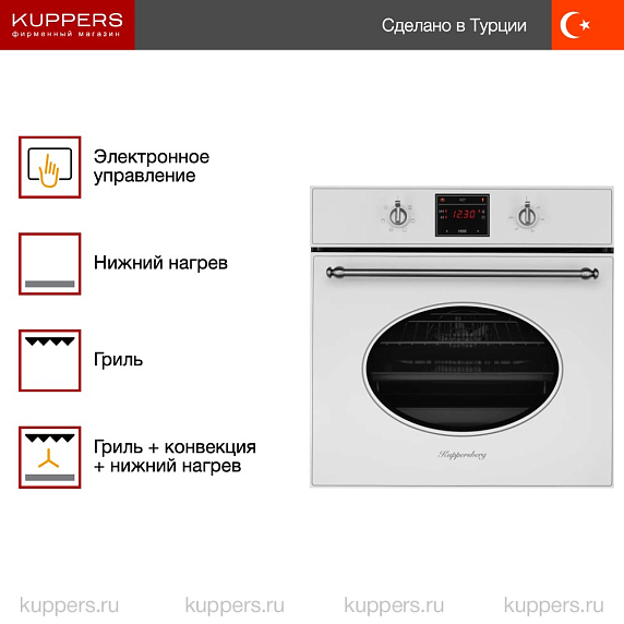 Торговая марка Kuppersberg уже 15 лет находится на рынке и входит в ТОП-10 производителей бытовой техники в России. По всему миру расположено более десяти заводов компании Куперсберг, на которых собирается техника. Приятный дизайн с лаконичными линиями отражает главную философию Северной Европы: надёжность — превыше всего. Поэтому можно быть уверенным, что даже газовая духовка прослужит долго и, при соблюдении указанных в инструкции, правил, останется максимально безопасным прибором. Электрические модели также отражают надёжность, при этом дают больше функций для процесса приготовления пищи.