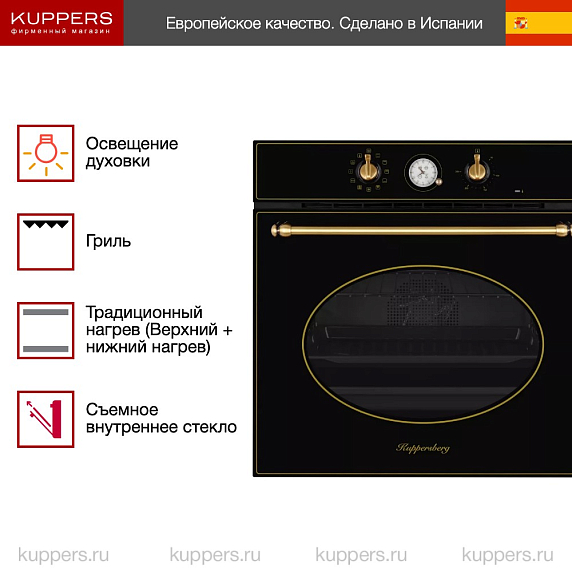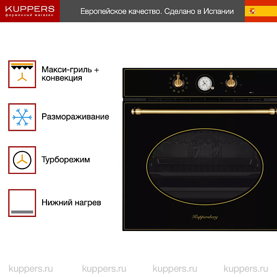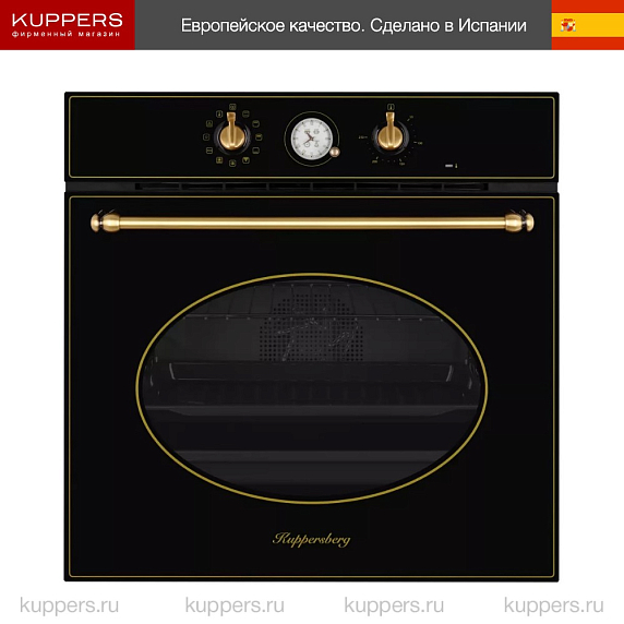 Kuppersberg SR 6911 B Bronze — модель духового шкафа выделяется элегантным черным корпусом, который гармонично сочетается как с классическими, так и с современными интерьерами. Декоративные элементы и ручки в благородном бронзовом оттенке добавляют устройству изысканности и подчеркивают его уникальный характер. Компактные габариты — высота и ширина около 60 см, глубина 55,9 см — позволяют легко интегрировать технику в стандартную нишу. Такие размеры делают ее универсальным выбором для просторных и небольших кухонь, не нарушая общую композицию пространства.