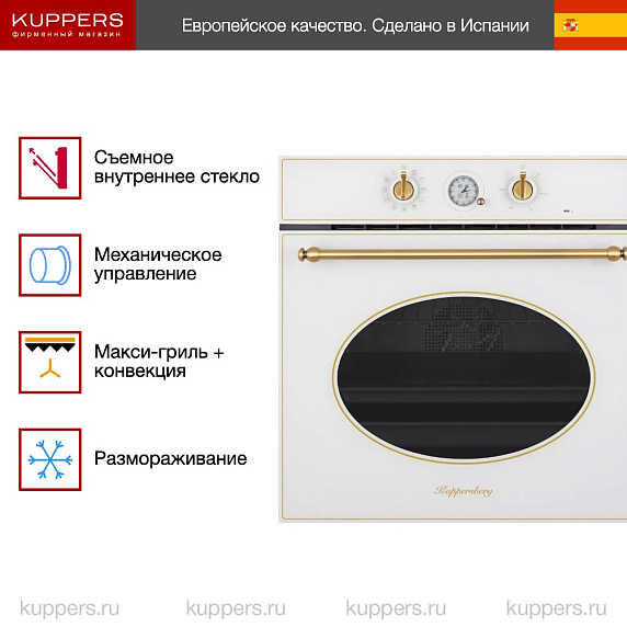 Торговая марка Kuppersberg уже 15 лет находится на рынке и входит в ТОП-10 производителей бытовой техники в России. По всему миру расположено более десяти заводов компании Куперсберг, на которых собирается техника. Приятный дизайн с лаконичными линиями отражает главную философию Северной Европы: надёжность — превыше всего. Поэтому можно быть уверенным, что даже газовая духовка прослужит долго и, при соблюдении указанных в инструкции, правил, останется максимально безопасным прибором. Электрические модели также отражают надёжность, при этом дают больше функций для процесса приготовления пищи.