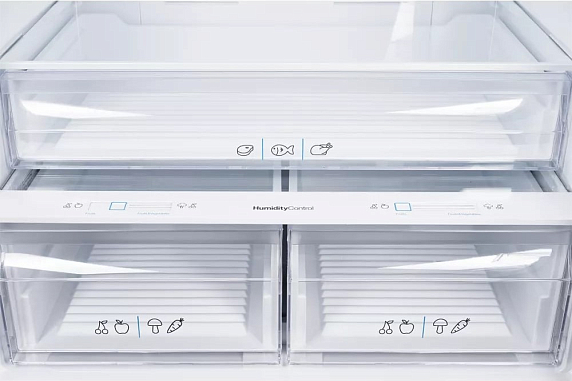 Внутри предусмотрено продуманное распределение пространства: общий полезный объем составляет 564 литра, что особенно оценят большие семьи или те, кто любит делать запасы продуктов. В холодильном отделении (400 литров) есть три вместительных ящика, каждый из которых подходит для хранения овощей и фруктов, а также зона свежести, где продукты дольше сохраняют свои качества. Стеклянные полки (три штуки, из которых две можно регулировать по высоте) позволяют удобно организовать внутреннее пространство под любые потребности. На дверце размещено шесть дополнительных полок для бутылок, соусов и мелких упаковок, а специальная подставка для яиц обеспечивает порядок и безопасность хранения.