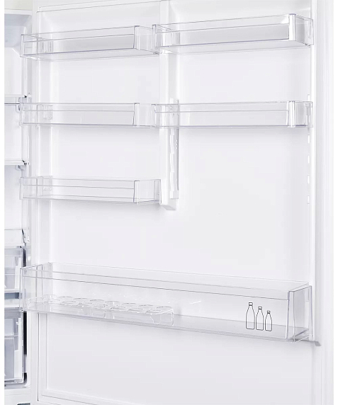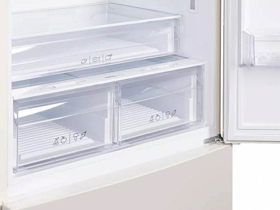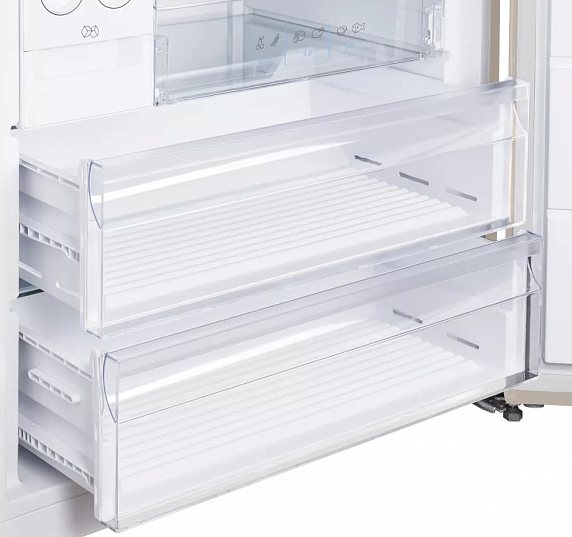 Морозильная камера (164 литра) оснащена тремя выдвижными ящиками, ледогенератором и автоматической системой размораживания. Такой объем позволяет замораживать до 10 кг продуктов в сутки, что удобно для заготовок на зиму или хранения полуфабрикатов. Благодаря системе Frost Free в обеих камерах не образуется иней, а автоматическое размораживание освобождает от необходимости вручную ухаживать за устройством.
