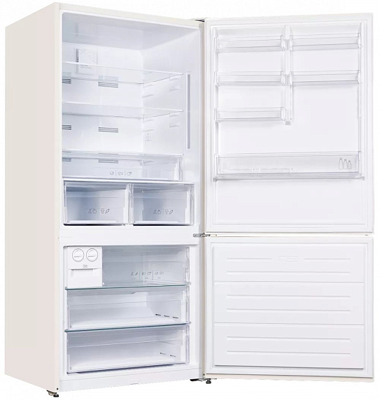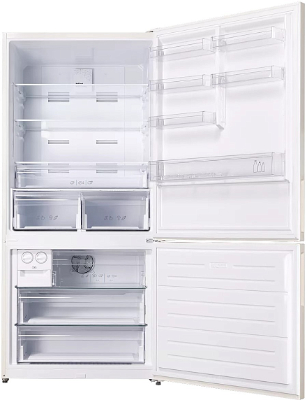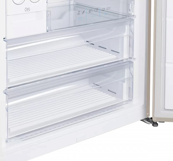 Эта модель сразу привлекает внимание благодаря своему утонченному внешнему виду: корпус оформлен в светлом, бежевом оттенке, который легко сочетается с разными стилями интерьера — от минимализма до классики. Нейтральная цветовая гамма позволяет устройству гармонично вписаться в современную кухню или просторную столовую, не перегружая пространство. Высота корпуса — 186 см, ширина — 84 см, а глубина — 75 см. Такие габариты обеспечивают вместительность, но при этом холодильник не выглядит громоздким, а его пропорции позволяют удобно разместить прибор даже в средних по размеру помещениях.