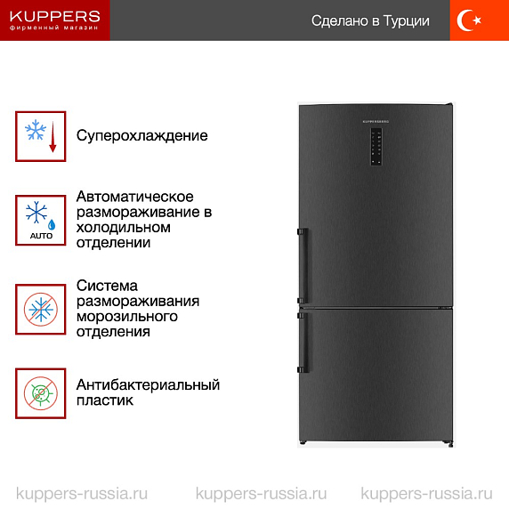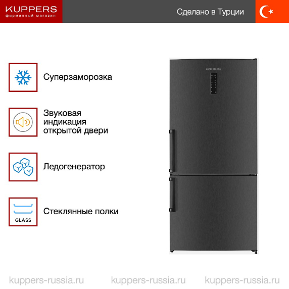 NRV 1867 DX — это вместительный двухкамерный холодильник, который гармонично сочетает лаконичную форму с выразительным внешним видом. Корпус выполнен в оттенке, напоминающем матовую сталь, а фурнитура выделяется контрастным черным цветом. Такое сочетание придает устройству современный и небанальный облик, который легко впишется как в минималистичный, так и в более насыщенный интерьер кухни. Высота почти в 2 метра и увеличенная ширина позволяют разместить внушительный запас продуктов, а глубина корпуса обеспечивает удобный доступ к каждому уголку внутреннего пространства.