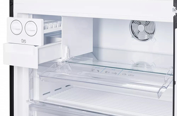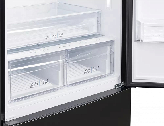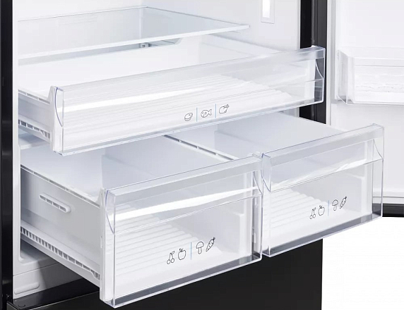 Морозильное отделение оснащено тремя вместительными ящиками и ледогенератором. За счет производительности до 11 кг заморозки в сутки можно быстро подготовить продукты к длительному хранению. Автоматическая система размораживания избавляет от необходимости вручную удалять наледь, а технология No Frost поддерживает оптимальный уровень влажности и предотвращает образование инея как в холодильной, так и в морозильной части.