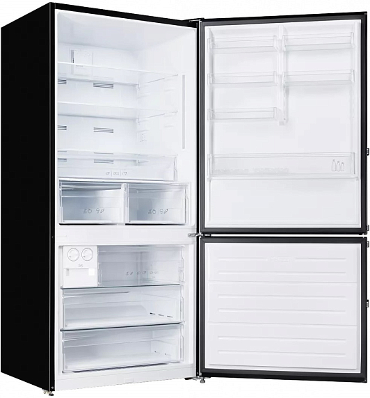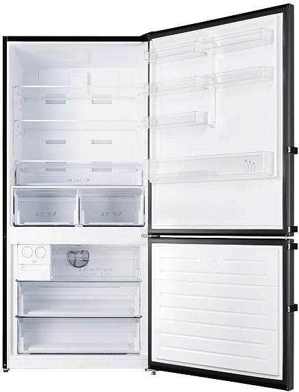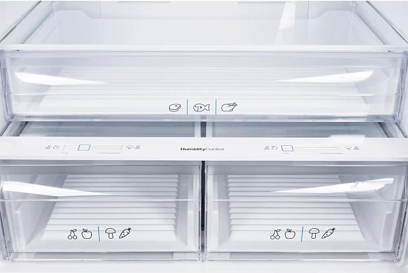 Внутри предусмотрено 564 литра полезного объема, что дает возможность хранить продукты для большой семьи или любителей заготавливать впрок. Холодильная камера рассчитана на 400 литров, а морозильная — на 164 литра. Для организации пространства предусмотрены три стеклянные полки, две из которых можно расположить на нужной высоте. Шесть дверных карманов позволяют разместить напитки, соусы и мелкие упаковки. Для овощей и фруктов выделены отдельные контейнеры — их три, что удобно для сортировки и поддержания свежести продуктов. Есть отдельная зона для хранения деликатных продуктов, требующих особого температурного режима.