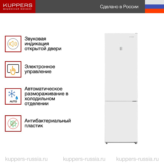 Двухкамерный холодильник Kuppersberg RFCN 2011 W выполнен в белом цвете. Яркая светодиодая подсветка увеличивает комфорт эксплуатации. С помощью удобного электронного управления и дисплея настроить работу устройства можно легко и быстро. Система NoFrost защищает камеры от образования льда, следовательно прибор не требует разморозки.
