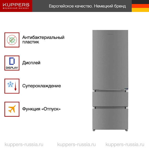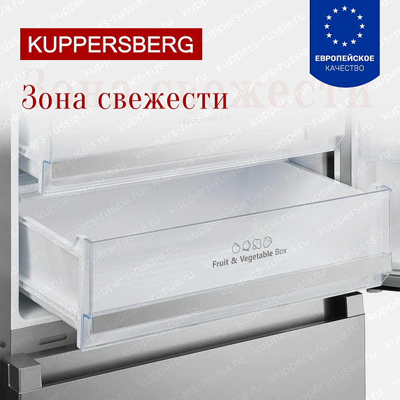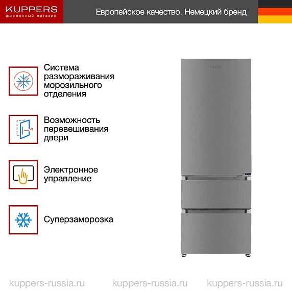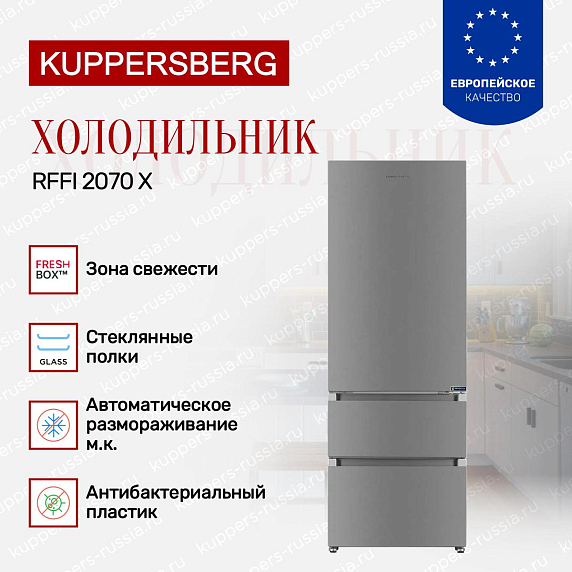 Холодильник Купперсберг RFFI2070X работает от напряжения 220-240 В и частоты 50 Гц. В устройстве используется один инверторный компрессор. Внутренние детали выполнены из антибактериального пластика, что обеспечивает дополнительную гигиену.