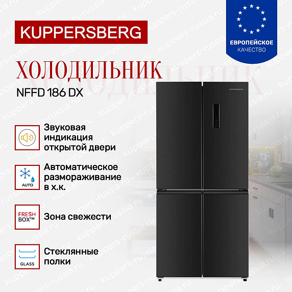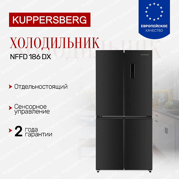 Холодильник Side by Side Kuppersberg NFFD 186 DX в чёрном исполнении — пример сбалансированного сочетания строгих линий и функционального подхода, созданный в направлении "Современный дизайн". Высокий корпус высотой 182.2 см, шириной 83 см и глубиной 64.7 см занимает оптимальное место на кухне, оставляя достаточно свободного пространства для удобного доступа к продуктам и комфортного размещения в стандартных кухонных нишах. Матовая или полуматовая поверхность фасадов подчёркивает минималистичную эстетику и легко сочетается с разными отделками интерьера, а чёткие геометрические пропорции делают устройство визуально лёгким и аккуратным.