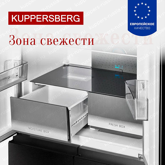Практичные детали дополняют удобство: зона свежести сохраняет оптимальный баланс влажности и температуры для быстрого доступа к наиболее скоропортящимся продуктам, а возможность установки шарнира по умолчанию справа или слева даёт свободу размещения в зависимости от планировки кухни.