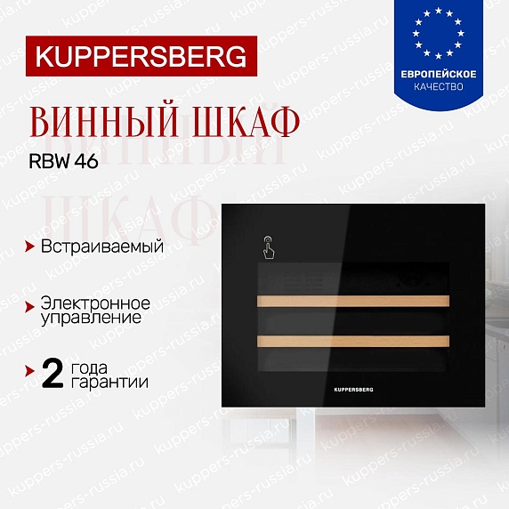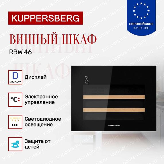 Винный шкаф Kuppersberg RBW 46 выполнен в духе современной эстетики и аккуратно интегрируется в мебельный ряд. Компактные внешние габариты (В 44.6 см, Ш 59 см, Г 56.3 см) скрывают продуманное внутреннее пространство объемом 62 литра, оптимизированное для хранения коллекции до 28 бутылок. Благодаря двум деревянным полкам укладка тары получается аккуратной и надежной: натуральная поверхность бережно контактирует с стеклянными ёмкостями, исключая скольжение и сохраняя эстетику экспозиции.