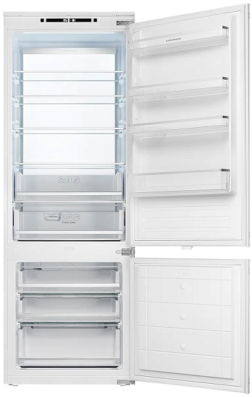 Внутри данной модели есть 5 ящиков и 8 полок, из которых одна регулируемая. Это позволяет гибко организовать пространство в соответствии с вашими потребностями. Зона свежести идеальна для хранения овощей и фруктов, сохраняя их свежесть и вкус. Светодиодное освещение обеспечивает яркое и равномерное освещение всего пространства.