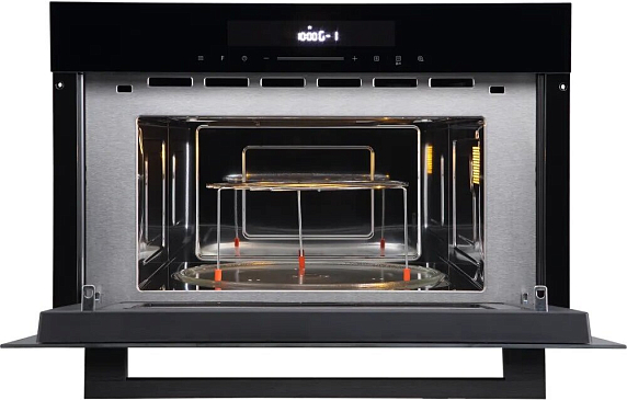 Современный дизайн техники выполнен в черном цвете, что делает ее стильным дополнением к любому интерьеру кухни. Внутренняя камера из нержавеющей стали обеспечивает долговечность и легкость в уходе. Дверца микроволновки откидная, что обеспечивает удобство использования.