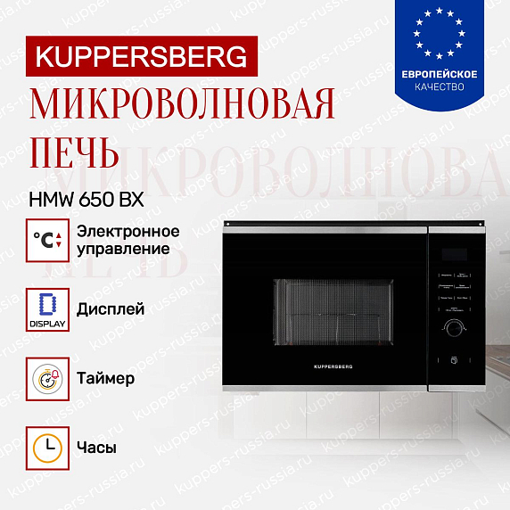 Встраиваемая микроволновая печь Kuppersberg HMW 650 BX относится к категории кухонной техники, монтируемой в мебельный гарнитур. Корпус выполнен в черном цвете с фурнитурой из нержавеющей стали. В материале рассмотрены конструктивные особенности, технические параметры, система управления и вопросы эксплуатации устройства.