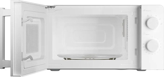 Интерьер устройства выполнен из эмали — материал выбран с прицелом на простую эксплуатацию и санитарную обработку; гладкая внутренняя поверхность препятствует накоплению загрязнений и не требует специальных моющих средств. Дверца навешана слева, что обеспечивает удобный доступ к содержимому устройства при размещении на столешнице или в нише; конструкция открывания продумана, чтобы исключить помехи в процессе эксплуатации. Внутри расположен поворотный стол диаметром 24.5 см: он равномерно распределяет воздействие волн по продукту, что снижает вероятность образования холодных зон, а сама платформа включена в комплектацию и не требует дополнительной покупки.