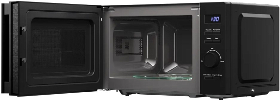 Внутренняя камера выполнена из гладкой эмали, что облегчает уход: достаточно протереть поверхность мягкой тканью, чтобы удалить следы жирных брызг и крошек. Диаметр поворотного подноса 25.5 см рассчитан на стандартные тарелки и миски, а поставляемый в комплекте поворотный стол обеспечивает равномерный прогрев без лишних усилий. Дверца с левой петлёй открывается удобно для размещения посуды, при этом петли и ручки окрашены в чёрный цвет, что создаёт цельный визуальный образ.