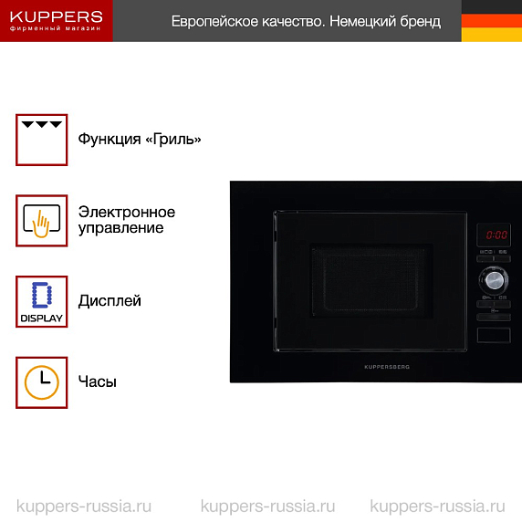 Управление микроволновой печью осуществляется при помощи электронного модуля и поворотных утапливаемых переключателей. Пока они не нужны, кнопки скрываются в корпусе и не нарушают гармонию интерьера кухни. На дисплее отображается вся необходимая информация о текущем режиме работы и времени приготовления. Есть таймер и часы. Корпус снаружи и внутри отделан особым покрытием, которое легко очищается. Дверца с защитным рисунком обеспечивает безопасность работы прибора. Открывается она по нажатию на кнопку.