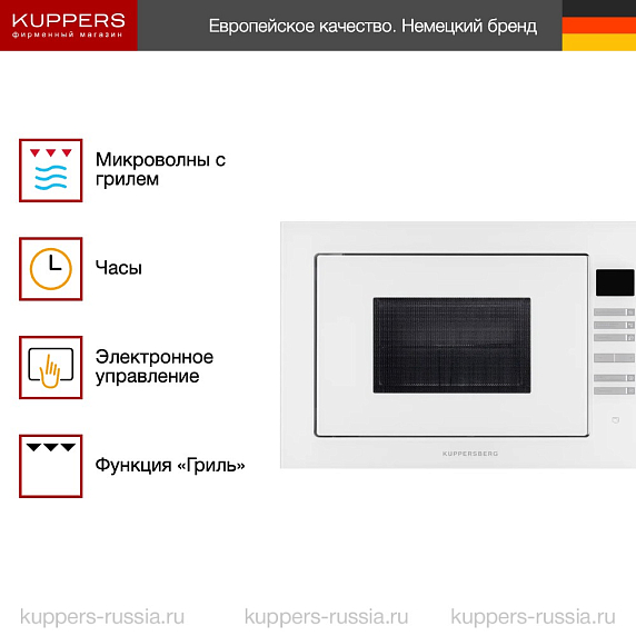 Внутренняя камера микроволновой печи изготовлена из нержавеющей стали, что обеспечивает ее долговечность и надежность. Габариты ниши для встраивания составляют 38,2×56,8×50 см, что делает ее идеальным выбором для большинства кухонных гарнитуров. Дверца в микроволновой печи Купперсберг HMW 645W классическая, навесная левая, открывается прикосновением к соответствующему элементу управления на панели. Мощность подключения прибора составляет 1450 Вт, микроволн — 900 Вт. В комплекте идет не только поворотный стол, но и решетка для гриля.