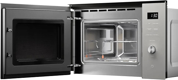 Материал внутренней камеры - нержавеющая сталь, что обеспечивает долговечность и простоту ухода за устройством. Дверца микроволновки навесная левая, что обеспечивает удобство использования. В комплекте идет поворотный стол и решетка для гриля.