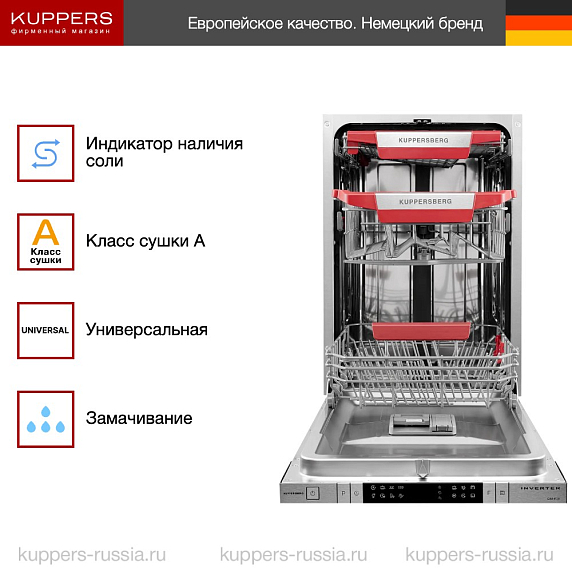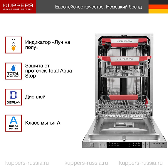 Встраиваемая посудомоечная машина Kuppersberg GIM 4578 — это высококачественный товар, произведенный в Китае и имеющий 24-месячную гарантию. Она обладает инверторным двигателем, который обеспечивает тихую и эффективную работу. Серебристая панель управления придает модели современный и стильный вид, в то время как ее компактные размеры (81.5 см в высоту, 44.8 см в ширину и 55 см в глубину) позволяют ей идеально вписываться в любую кухню.