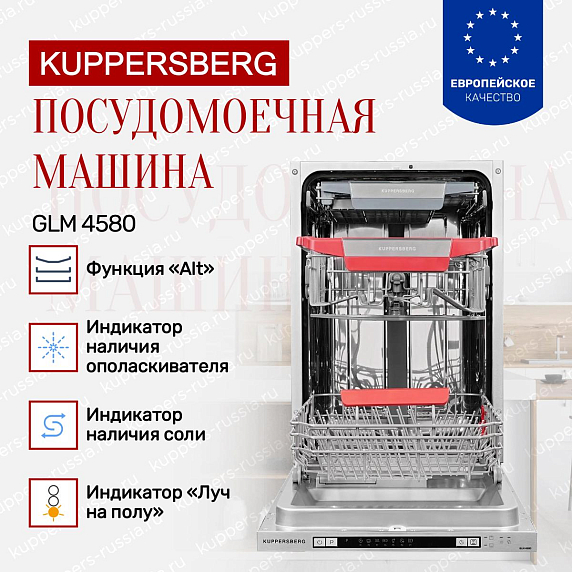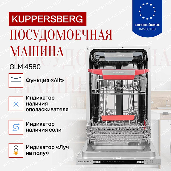 Индикаторы наличия соли и ополаскивателя предупредят, когда средства закончатся и потребуется добавить еще. Встраиваемая посудомоечная машина Купперсберг GLM 4580 имеет электронный тип управления. Для переключения настроек, выбора функций используется цифровой дисплей. Простая система контроля за кухонным оборудованием делает ее более универсальной. Отложенный старт позволяет установить начало мойки на любое удобное для Вас время (от 1 до 24 часов).