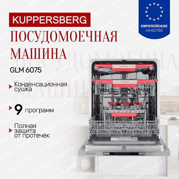 Посудомоечная машина Kuppersberg GLM 6075 оснащена конденсационной сушкой. Это означает, что после финального ополаскивания температура внутри бункера достаточно высокая. А затем резко начинает остывать, из-за чего образуется конденсат. Данный способ весьма экономичен, поэтому аппарат не станет тратить лишнюю электроэнергию. По монтажу прибор относится к типу встраиваемых, поэтому сверху обычно закрывается декоративной панелью, чтобы гармонично вписаться в кухонный гарнитур. Устройство могут называть полноразмерным, поскольку его ширина составляет 60 см. А загрузка достигает 14 комплектов.