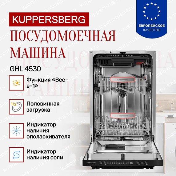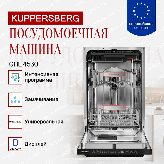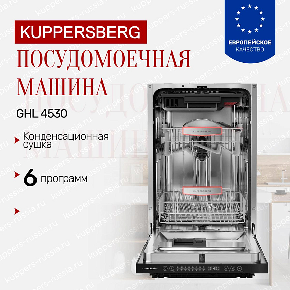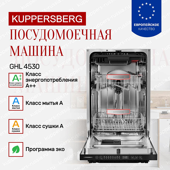 Встраиваемая посудомоечная машина KUppersberg GHL 4530 — это современное решение для комфортного и эффективного ухода за посудой в вашем доме. Ее изящный дизайн выполнен в рамках коллекции «Современный дизайн», что придает интерьеру кухни стильный и аккуратный вид. Черная панель управления гармонично сочетается с корпусом, создавая элегантный и лаконичный образ, который легко впишется в любой кухонный гарнитур. Благодаря компактным габаритам (высота 81,6 см, ширина 44,8 см, глубина 57,5 см) и возможности точного встраивания в нишу размером 81,8-87,8×45,2×57,7 см, устройство оптимально подходит для помещений с ограниченным пространством.