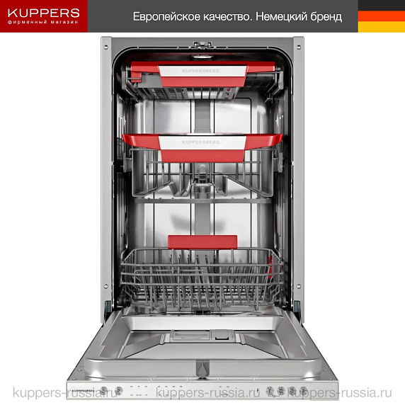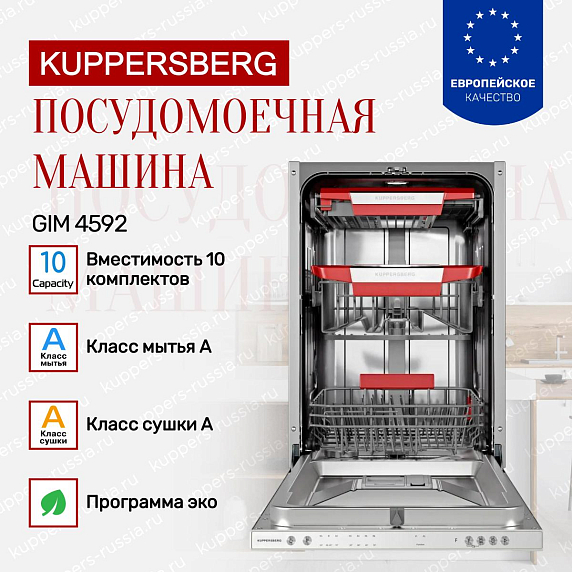 Встраиваемая посудомоечная машина Kuppersberg GIM 6092 полностью монтируется в нишу и закрывается мебельным фасадом. Модель обладает панелью управления в черном цвете и имеет следующие габариты: высота — 81,5 см, ширина — 59,8 см, глубина — 55 см. Она рассчитана на 15 стандартных комплектов, в которые входят тарелки, чашки и приборы, а если вам нужно будет положить кастрюлю, противень или подобные крупные предметы, общий объем загрузки уменьшится.