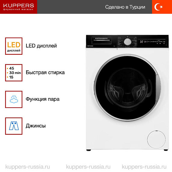 Устройство оснащено функциональным LED-дисплеем, который позволяет легко управлять всеми режимами и функциями. Есть возможность отложенного старта, что позволяет запланировать стирку на удобное для вас время. Кроме того, машина оборудована функцией пара, которая помогает убрать складки и запахи с одежды без необходимости глажки.