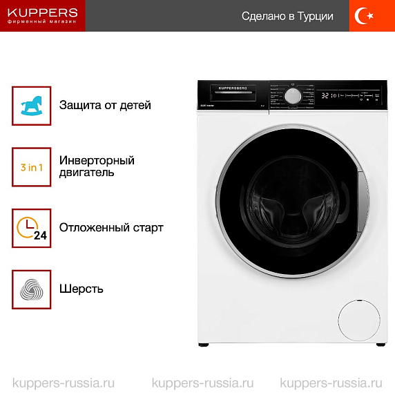 Стиральная машина Kuppersberg WM 490 W — это устройство, которое сочетает в себе современный дизайн и высокую функциональность. Она выполнена в классическом белом цвете, который легко впишется в любой интерьер. Модель отличается компактными размерами: высота составляет 84.5 см, ширина — 60 см, а глубина — всего 50 см. Это позволяет установить ее даже в небольшой ванной комнате или на кухне.