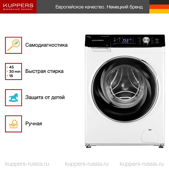 Стиральная машина Kuppersberg WM 580 W выполнена в белом цвете с черной панелью управления и люком, вмещает в себя до 9 кг белья. Сенсорное управление и поворотный переключатель обеспечат легкую установку настроек и выбор одной из 16 программ. Благодаря отложенному старту вы сможете запустить процесс стирки в любое удобное вам время.