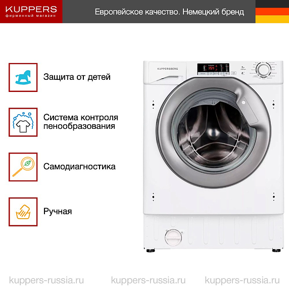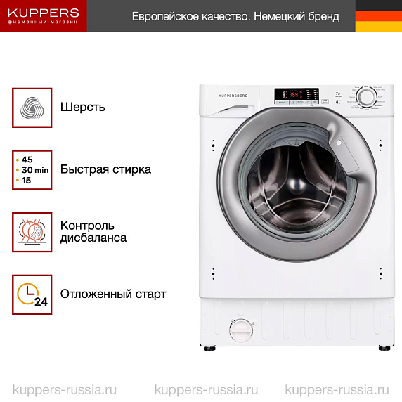 Стиральная машина KUPPERSBERG WM1477 имеет встраиваемый тип установки, фронтальную загрузку до 7 килограмм, максимальную скорость отжима — 1400 оборотов в минуту. Габариты конструкции следующие: 82 сантиметра в высоту, 59.6 в ширину и 54 в глубину, она встраивается в нишу с размерами 82.5 сантиметра в высоту, 60 — в ширину и столько же в глубину, объем барабана составляет 56 литров. Выполнена в современном дизайне, в интерьере можно разместить максимально компактно, будет смотреться привлекательно, благодаря классическому белому цвету сможет отлично сочетаться с уже имеющимся набором бытовой техники.