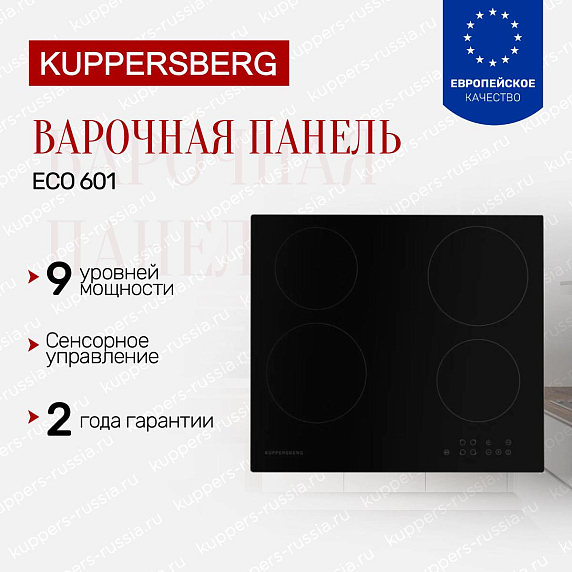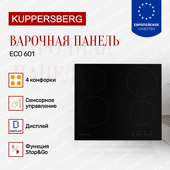 Электрическая варочная панель Kuppersberg ECO 601 представляет собой эргономичное и функциональное решение для современных кухонь, где важны компактность, стильный внешний вид и надежность в эксплуатации. Технология Hi-light гарантирует быстрый разогрев и стабильное поддержание температуры при экономном потреблении энергии, а девять градаций мощности позволяют точно дозировать интенсивность приготовления. Сенсорное управление с дисплеем, таймер с автоотключением, функция Stop & Go, индикация остаточного тепла и защита от детей делают использование безопасным и комфортным. Стеклокерамическая поверхность с прямыми краями облегчает уход и сохраняет декоративные свойства. Поставка осуществляется через официальную дилерскую сеть, что подтверждает подлинность изделия и наличие гарантийных обязательств производителя.