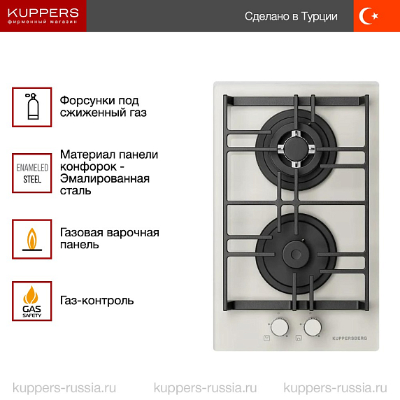 Газовая варочная панель Kuppersberg FG 39 W сочетает аккуратный внешний вид и продуманную функциональность, созданную для тех, кто ценит минимализм и удобство. Корпус выполнен в белом цвете, что делает прибор универсальным решением для интерьеров с различной палитрой отделки; хромированные элементы из нержавеющей стали добавляют благородный акцент, формируя аккуратную и легкую визуальную ауру. Закаленное стекло рабочей поверхности устойчиво к термическим и механическим нагрузкам, легко очищается от загрязнений и сохраняет привлекательность при регулярной эксплуатации. Отсутствие окантовки обеспечивает бесшовное расположение в столешнице, подчеркивая архитектурную строгость и облегчая уход за зоной готовки. Решетки из чугуна отличаются стабильностью и долговечностью, надежно фиксируют посуду, включая сковороды WOK, и передают тепло равномерно, что важно при создании блюд с интенсивной термической обработкой.