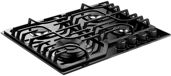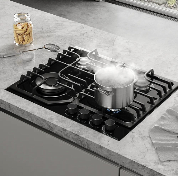 Дизайн продуман до мелочей: чёрная отделка в сочетании с закалённым стеклом создаёт эффект ровной зеркальной поверхности, а скошенные грани аккуратно отражают свет, образуя аккуратный контур. Эргономика предусмотрена для удобства повседневного применения: раскладка конфорок продумана так, чтобы вместить посуду разных диаметров, при этом чугунные решётки обеспечивают устойчивость тяжёлых сковород и кастрюль. Управляющие механизмы обладают тактильной отдачей, понятной на интуитивном уровне, и не требуют длительного привыкания. Чёрные элементы декора минималистичны и подчёркивают общую сдержанность стилистики, оставаясь нейтральными для различных цветовых решений интерьера.
