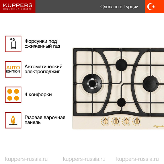 Газовая варочная панель Купперсберг FS 604 C Bronze оснащена четырьмя зонами нагрева. Вы сможете приготовить несколько блюд одновременно, тем самым сэкономив время. Конфорки разного диаметра подходят для любой посуды. Слева расположена конфорка WOK, главная особенность которой — несколько рядов пламени. Она предназначена для приготовления азиатских деликатесов, а также других блюд, которые готовятся при высокой температуре. Механическое управление интуитивно понятное и простое в использовании. Электроподжиг значительно облегчает процесс готовки. Нужно нажать на переключатель и повернуть его. Пламя загорится от искры. Вам больше не придется пользоваться спичками и зажигалками.
