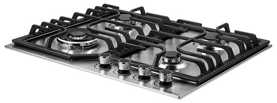 Варочная панель выполнена в цвете «нержавеющая сталь», она отличается прочностью и долговечностью. Черная фурнитура придает ей элегантность и изысканность. Панель конфорок также выполнена из материала нержавеющей стали, что обеспечивает равномерное распределение тепла и удобство в использовании. Окантовка скошенного края добавляет изысканности и оригинальности. Решетки из чугуна не только прочные и надежные, но и легко очищаются от грязи и жира.