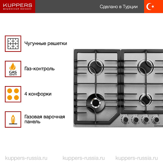 Газовая варочная панель Kuppersberg FS 63 X представляет собой идеальное сочетание функциональности, современного дизайна и высокого качества исполнения. Она органично впишется в любую кухню, став незаменимым помощником благодаря своим возможностям быстрого и равномерного нагрева, а также продуманным системам безопасности, которые обеспечивают комфорт и защиту во время приготовления пищи.