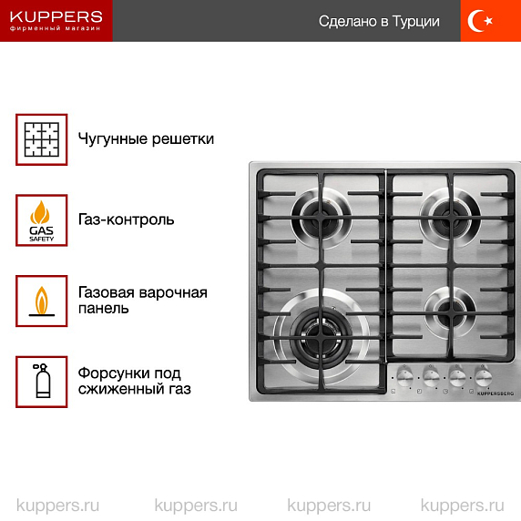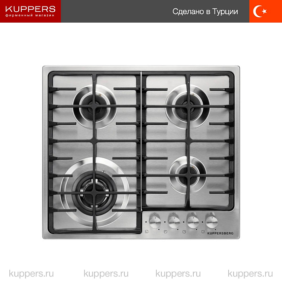 Варочная панель Kuppersberg FS 64 X - это стильная и функциональная газовая встраиваемая варочная панель, выполненная в серебристом цвете из нержавеющей стали. Панель оснащена четырьмя газовыми конфорками, включая конфорку WOK и одну с тройным пламенем. Управление осуществляется поворотными переключателями спереди, а электроподжиг автоматический. Особенностью этой модели является газ-контроль, который обеспечивает безопасность использования, автоматически отключая подачу газа при угасании пламени.