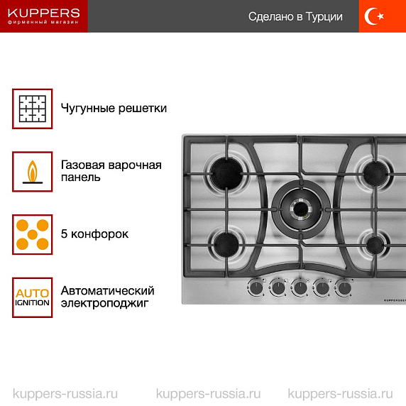Управление реализовано через поворотные переключатели, интуитивно понятные и удобные при готовке с насыщенными переходами мощности; они обеспечивают точную настройку пламени для медленного томления или сильного нагрева. Материал решёток — чугун, что гарантирует стабильность массивной посуды и долгий срок службы под нагрузками, а сама рабочая панель из нержавеющей стали легко переносит термические и механические воздействия, допускает регулярную очистку без потери внешнего вида. Встроенный держатель для турки станет удобным элементом для поклонников напитков, требующих специфической посуды и нагрева на слабом огне.